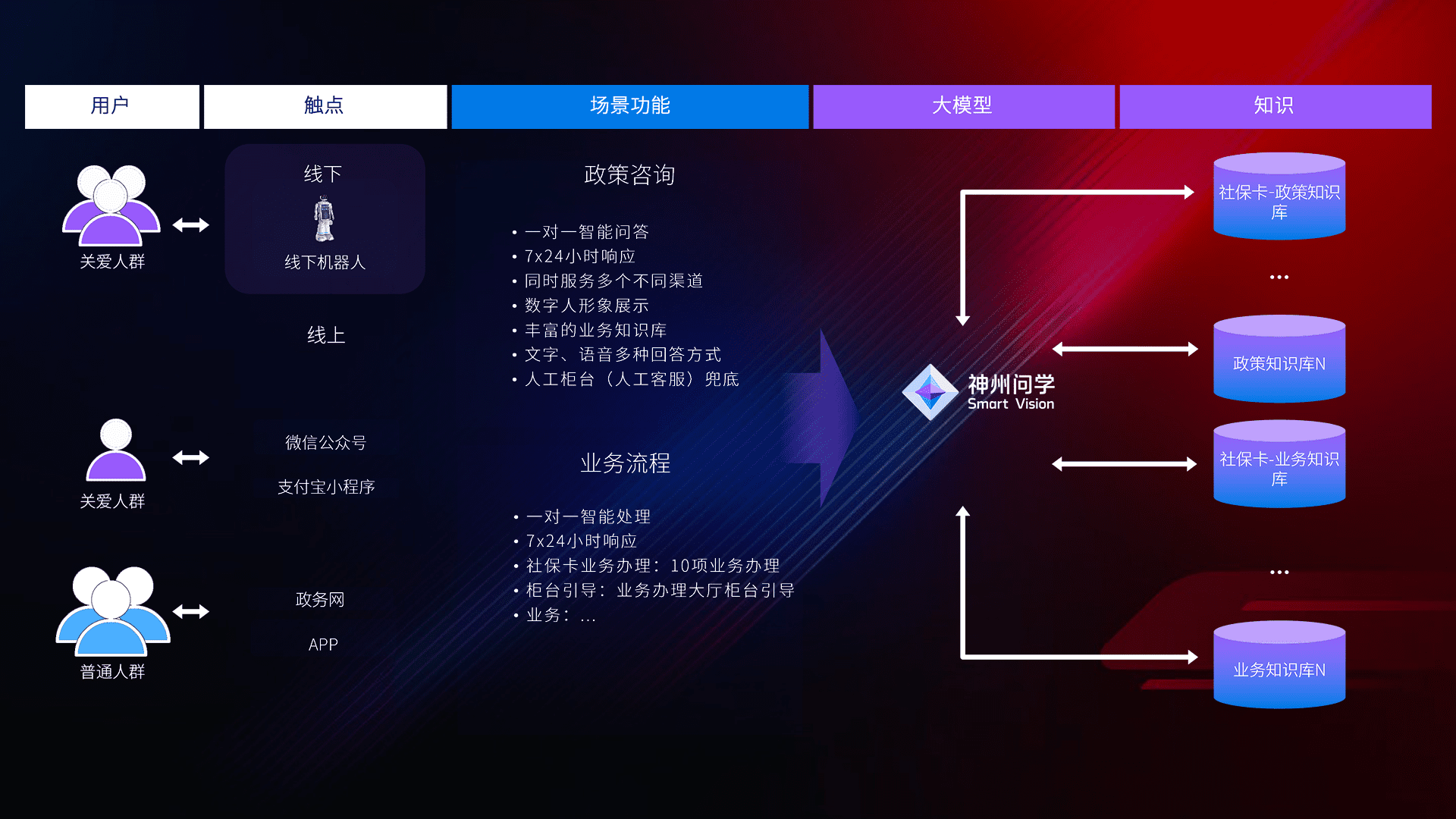• 线上线下全覆盖:线上提供微信公众号、、支付宝小程序、、、、政务网、、app多种渠道,,,与线下机器人形成完整服务体系。。
