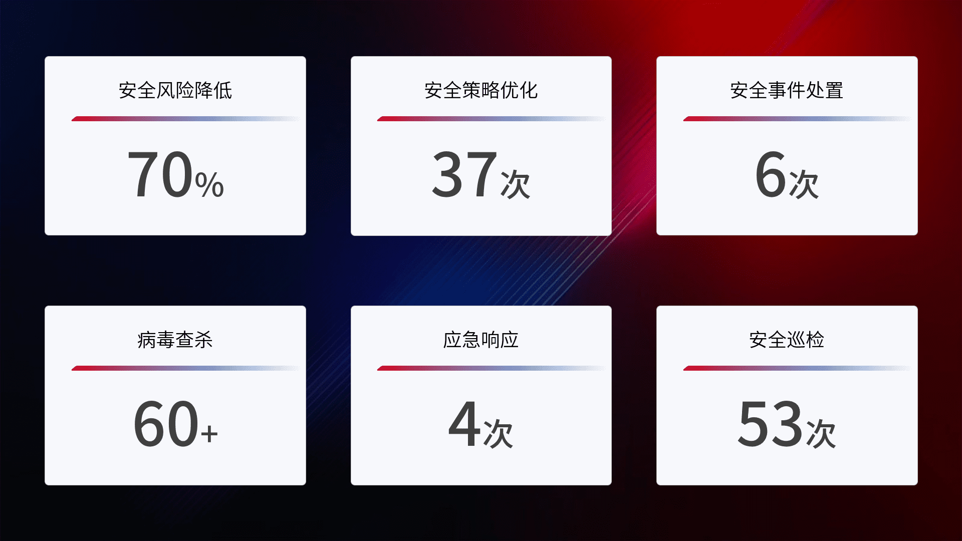 提供全面的安全事件报告体系,,包括处置报告、、、、周报、、、季度和年度总结,,,,结合持续监控,,,帮助客户深入了解网络安全状况。。